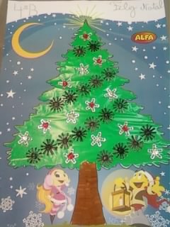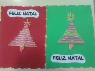 Realizamos diversas atividades na escola. Elaboramos um postal lindíssimo com palhinhas, muito original. Também decoramos uma árvore de Natal com cápsulas de café e latinhas. Ficou muito bonita.